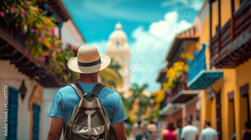 traveler, straw, hat, exploring, colourful, street, backpack, travel, adventure, vacation, summer, urban, tour tourism, culture, city, architecture, scenic, journey, sightseeing, exploration, casual attire, wanderlust, vibrant, walking, discovery, backpacker, sunny, outdoors, destination, cultural, environment, leisure, relaxed, historic, picturesque, lifestyle, tropical, scenery, holiday, ai, generative, man, people, person, boy, guy, fun