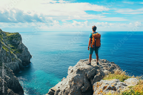 traveler, standing, cliff, panoramic, ocean view, travel, scenic, nature, landscape, ocean, view, adventure, sea, horizon, travel destination, scenic view, panoramic view, seaview