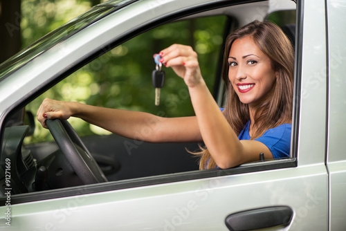 woman, window, driving, holiday maker, car, vacation, travel, smiling, journey, enjoying, happiness, beautiful, holding, sitting, new, car rental, owner, transportation, showing, pride, portrait, closeup, horizontal