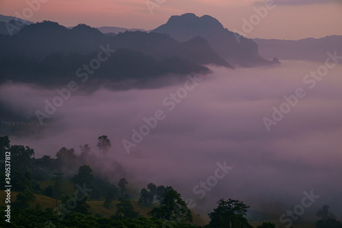 Traveling to see the sea of mist and sunrise in the morning at the view of Phu Lanka, Phayao Province, Thailand