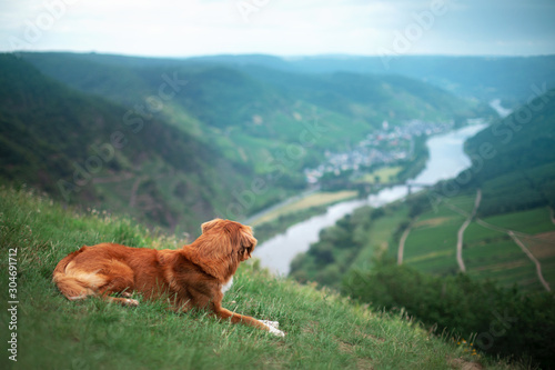 Traveling with a dog in nature. Nova Scotia Duck Tolling Retriever on a hill overlooking the river.