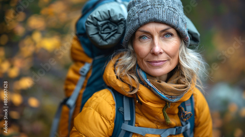 Traveller senior lady hiker with backpack looking at camera