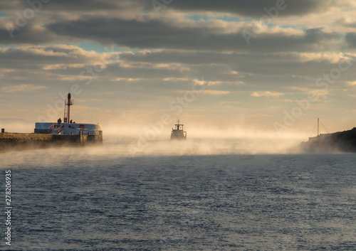 Trawler leaving Looe Harbour on a misty morning in Cornwall