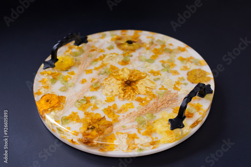 Tray made of dried flowers and epoxy resin.