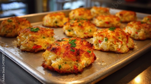 Tray of Crabcakes. Delicious Crab Cakes Freshly Baked in the Oven