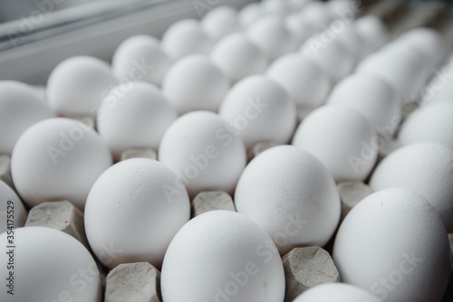 Tray of white fresh eggs close-up on a cardboard form. Agricultural industry