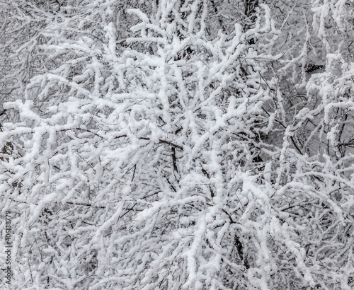 Tree branches in the snow close -up in winter. Background