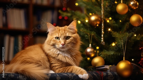 tree, christmas, cat, book, illustration, ginger, ornament, holiday, spirit, decorated, photo, star, fur, warm, tone, stack, arranged, camera, season, festive, cosy, joyful, celebration, tradition, story, reading, festivity, cheer, magic