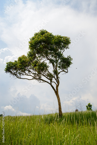 Tree in tall, grassy field on a cloudy day. Vertical orientation. Khao Yai, Nakhon Nayok, Thailand. Travel and nature concept.