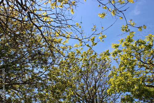 tree, sky, nature, leaf, forest, green, leaf, autumn, tree, blue, spring, branch, tree branch, foliage, season, plant, summer, yellow, outdoors, fall, trunk, wood, park, landscape, wood