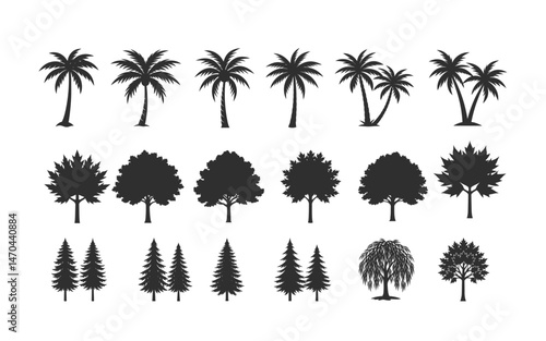 Tree Silhouette Vector Set – Palm, Deciduous, Coniferous, and Willow Trees in Black on White Background
