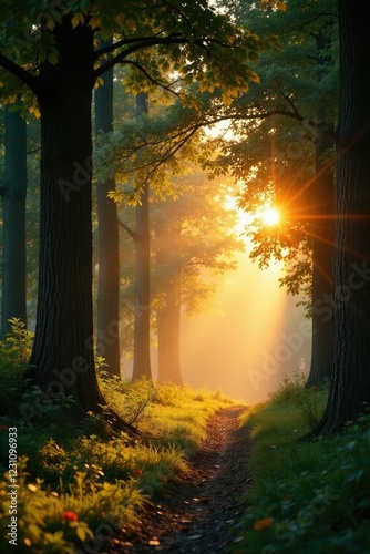 Trees and foliage glow with soft golden light at summer evening, evening, colors, dusk