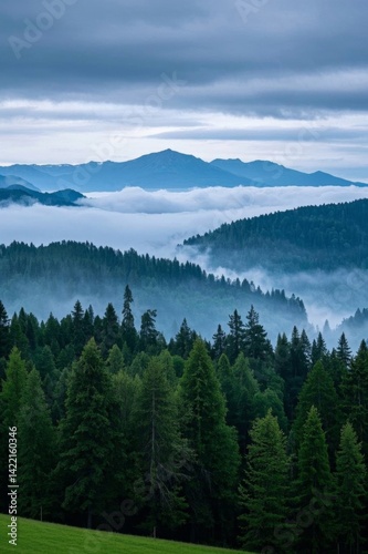 mountain, landscape, mountain, forest, nature, snow, sky, tree, tree, view, cloud, pine, travel, fog, winter, peak, vale, green, range, summer, alps, cloud, hill, rocky, rock