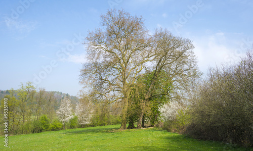 tree, tree, forest, spring, countryside, landscape, grass, scenic, leisure, rural, agriculture, nature, perspective, outdoors, hill, craggy, field, meadow, season, horizon, green, blue, sky, cloud, sunlight, vegetation, tranquil, holland
