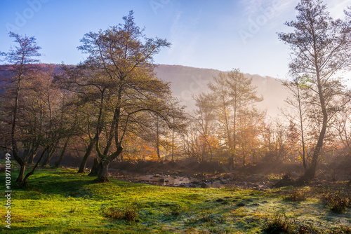 trees in morning mist. grassy meadow in the valley. scenery with forested hills of distant mountains in morning light. countryside landscape of transcarpathia, ukraine in autumn