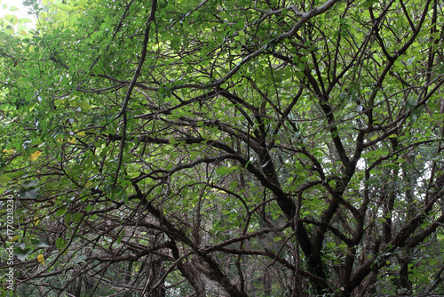 Trees in natural forest background. Tree branches with lush green leaves in late summer.