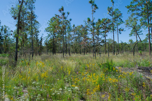 forest, tree, nature, landscape, tree, sky, green, grass, wood, wood, pine, leaf, summer, plant, meadow, wildflower, yellow, flower