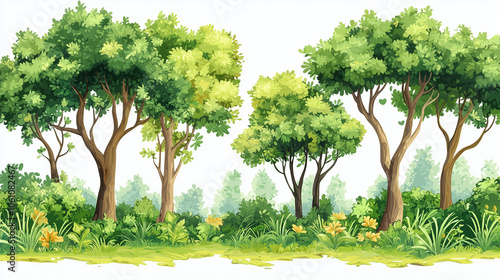 trees isolated on white background, Watercolor painted sturdy trunks that branch out into a full, round canopy of leaves. Green grass and bushes - a painting of mature trees