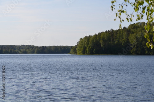 Trees on the shore of the lake. Summer day near a forest lake. Trees with long curved branches grow on the shore. Behind them is the blue expanse of water and a dense forest on the other side.