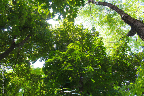 "Trees with leaves in spring, trees in the park, sun rays in the forest, green leaves in the fores