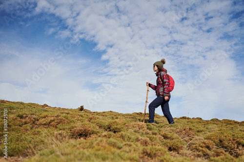 copy space, walking, traveler, holiday maker, terrain, slope, half face, outside, 1, nature, moss, landscape, hill, hiker, blue skies, backpacker, adventure, cloud, trekking, huesca, enjoying, low angle, caucasian, white, woman, girl, female, person, people, adult, adult, 20s, grown-up