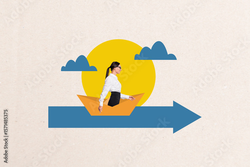 Trend artwork banner sketch collage of arrow point abroad travel global destination vacation agency sea paper boat young lady sit smile
