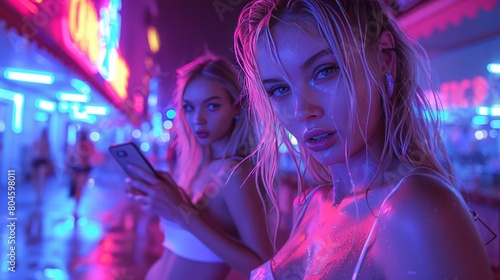 Trendy adolescent girls using mobile phone while strolling on urban city streets