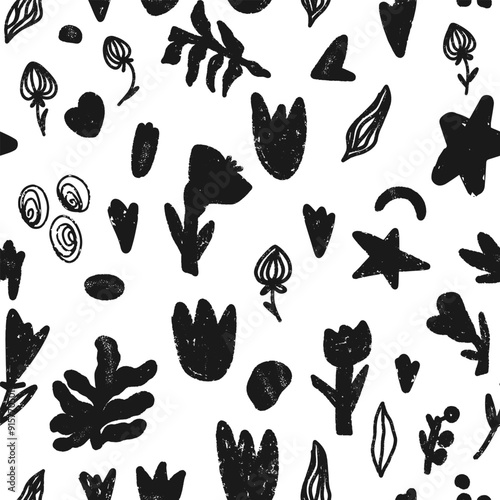 Trendy minimalism modern monochrome floral pattern Grunge, shabby texture elements Scandinavian motifs Vector seamless pattern