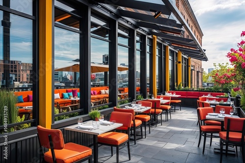 Trendy Restaurant Facade with Panoramic Windows Vibrant Terrace Seating and Contemporary Design