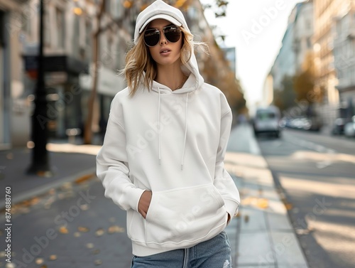 woman, hoodie, cap, urban, street, fashion, trendy, style, casual attire, white, city, modern, young, girl, sidewalk, lifestyle, cool, hip, chic, stylish, walking, jean, confident, model, female, sunglasses, casual clothes, fashionable, youth, day, elegance, contemporary, pedestrian
