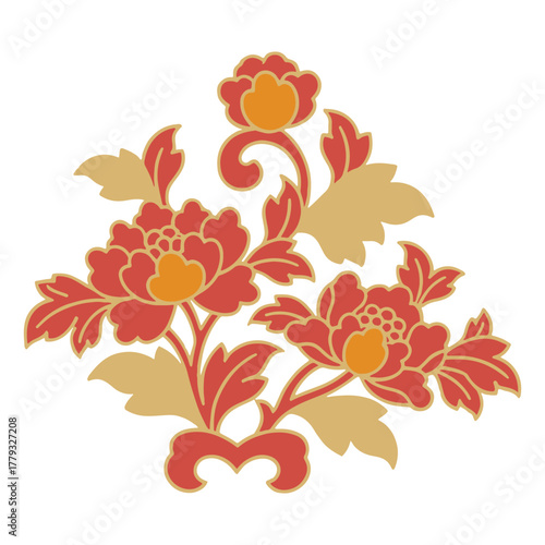 Triangular Floral Design – Red and Gold Vector with Three Stylized Flowers