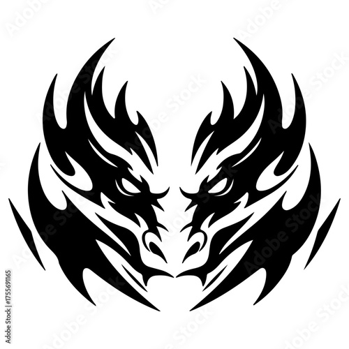 dragon, tribal, face, symmetric, black-and-white, illustration, vector, flames, horn, eye, snout, fierce, abstract, fantasy, mythical, creature, bold, graphic art, line art, silhouette, intense