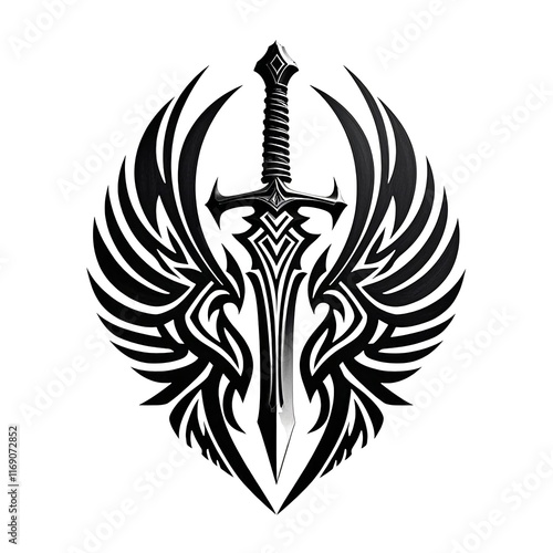 sword, tribal, wing, illustration, black, white, design, tattoo, logotype, decorative, art, symmetric, detail, graphic, element, pattern, sharp, fantasy, culture, symbol, heritage, fierce, strength, blade, ornate, unique, creative, modern, vintage, aesthetic, silhouette, artwork, mythology, emblem, intricate, bold, striking, visual, concept, ornamental, artistic, identity, representation, craftsmanship, style, inspiration, tradition, elegance, beauty