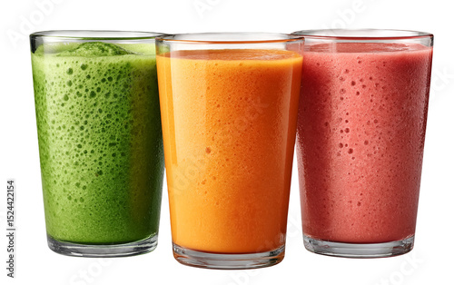Trio of colorful smoothies in green, pink, and orange, served in clear glasses neatly arranged on a white background. Perfect for healthy lifestyle, nutrition, and food promotion.