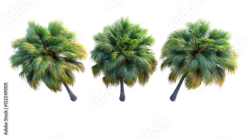 Trio of Tropical Palm Trees: A picturesque view featuring three vibrant palm trees, each flaunting lush green fronds and sturdy trunks, creating a tropical vibe.