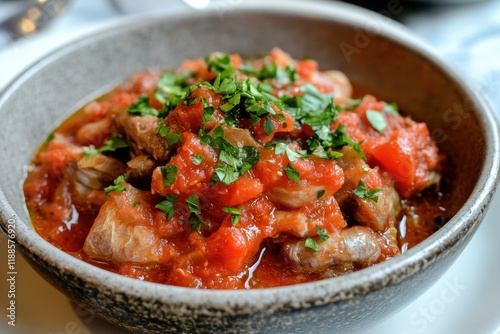 Tripe soup with red sauce and parsley