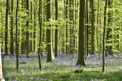 Troncs de jeunes hêtres sombres contrastant avec la lumière de vers la fin de journée et surtout le tapis mauve de milliers de jacinthes sauvages au sol ,à la forêt de Hallerbos près de Halle