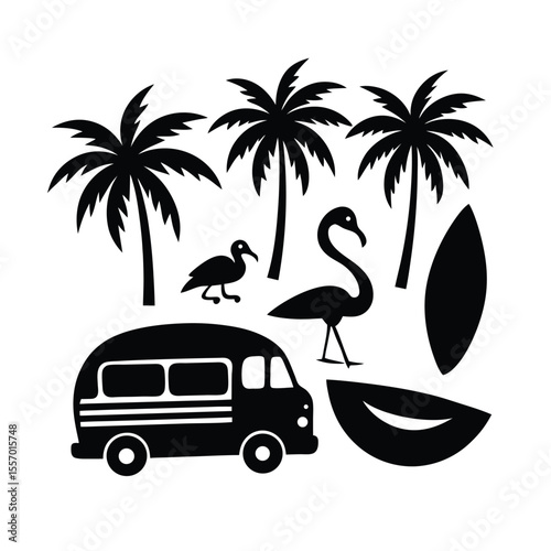 tropical, beach, surf, vector, summer, vacation, ocean, sea, island, palm tree, wave, sun, sand, holiday, travel, illustration, design, graphic, set, collection, tropical beach, surfboard, coconut, cocktail, sunset, sunrise, paradise, coast, shore, relaxation, leisure, water, sky, cloud, silhouette, background, pattern, icon, symbol, element, artwork, clip art, cmyk, greyscale
