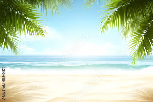 beach, ocean, sand, palm tree, summer, tropical, background, illustration, sea, wave, vacation, paradise, sunny, coast, turquoise, nature, relax, holiday, get-away, serenity, calm, calmness, escape, peace, blue, green, sun, sky, cloud, water, dune, shore, horizon, heat, warmth, vibrant, beautiful, scenic, picturesque, idylli, dreamy, exotic, lush, bright, cheerful, happy, joyful, peaceful