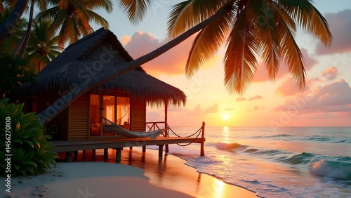 Tropical beach bungalow at sunrise with palm trees, offering ocean views and tranquil relaxation.