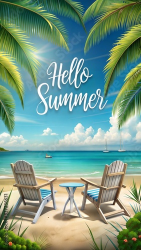 Tropical Beach Chairs With Ocean View and Hello Summer Greeting. Generative AI