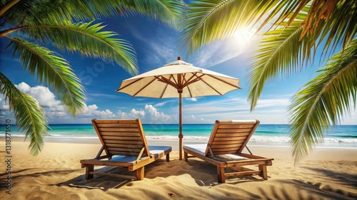 Tropical beach paradise with sun-drenched lounge chairs and umbrellas on the sandy coast