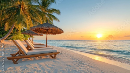 beach, sunset, paradise, vacation, tropical, chair, relaxation, ocean, palm tree, sand, summer, holiday, travel, luxury, resort, island, seascape, sunshine, calm, serenity, escape, freedom, happiness, warm, gold, sky, horizon, water, coastal, scenic, view, nature, peaceful, tranquil, relaxing, solitude, exotic, dreamscape, get-away, retreat, rest, sun, seacoast, coast