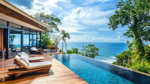 Tropical beach villa with a pool and stunning ocean view, no people. Open space for copy on the deck.