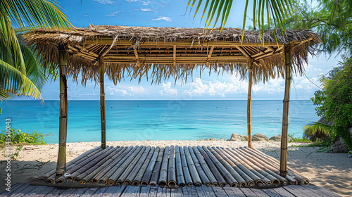 Tropical beach with bamboo bungalows and coconut palm leaves