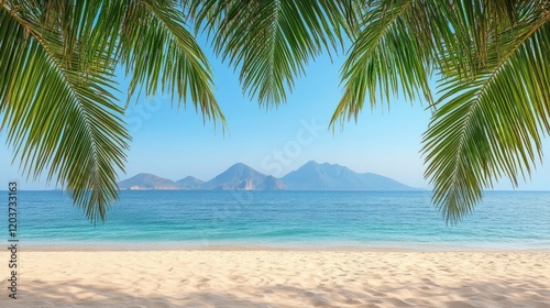 tropical, beach, copy space, palm, ocean, island, sand, sea, water, blue, sky, horizon, landscape, scenery, nature, travel, vacation, paradise, serene, tranquil, clear, hot, peaceful, framing, escape, greenery, get-away, calm, lush, exotic, idylli, distant, coast, leaf, sunny, relaxation, picturesque, shore, outdoors, beautiful, view