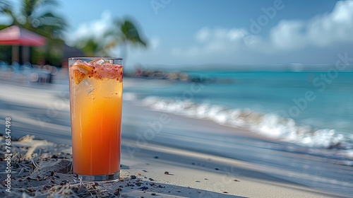 Tropical cocktail on sandy beach with sea view
