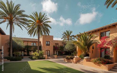 courtyard, palm tree, tropical, architecture, building, exterior, sunny day, vacation, travel, tour tourism, resort, hotel, idylli, landscape, garden, lawn, grass, plant, tree, sky, cloud, sunny, outdoors, residential, property, real estate, home, house, accommodation, destination, holiday, get-away, relaxation, tranquil, serene, peaceful, scenic, picturesque, summer