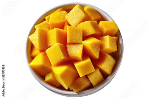 Tropical Delight in a Bowl: A close-up shot showcases a vibrant bowl filled with perfectly cubed, juicy mango, ready to tantalize the senses.