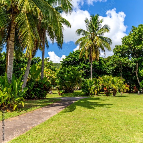 tropical, garden, palm, tree, path, lush, green, sunny, blue, sky, pathway, plant, flower, lawn, nature, scenic, beautiful, outdoors, vegetation, summer, idylli, tranquil, peaceful, relaxing, landscape, high-coloured